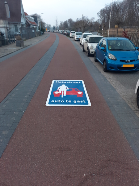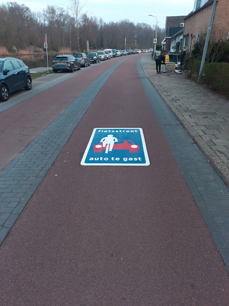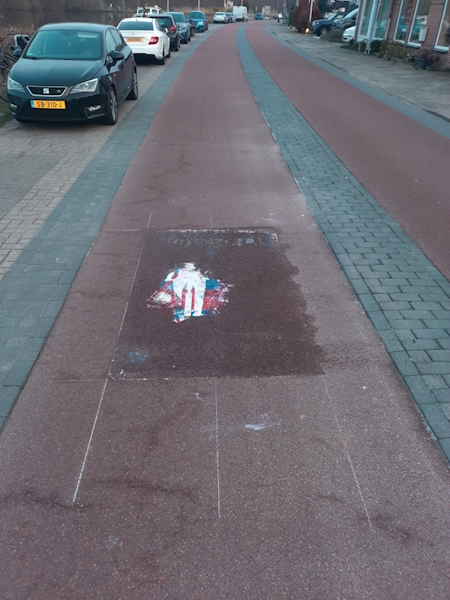 Tot onze grote verbazing zijn er in de Fietsstraat toch nog logo's van "Fietsstraat - Auto te Gast" op het wegdek aangebracht, het heeft even geduurd, maar na 8 jaar blijken ze een oplossing te hebben gevonden voor het niet gevaarlijk glad zijn, voor fietsers, van deze logo's, wat als (onjuist) argument werd gebruikt.